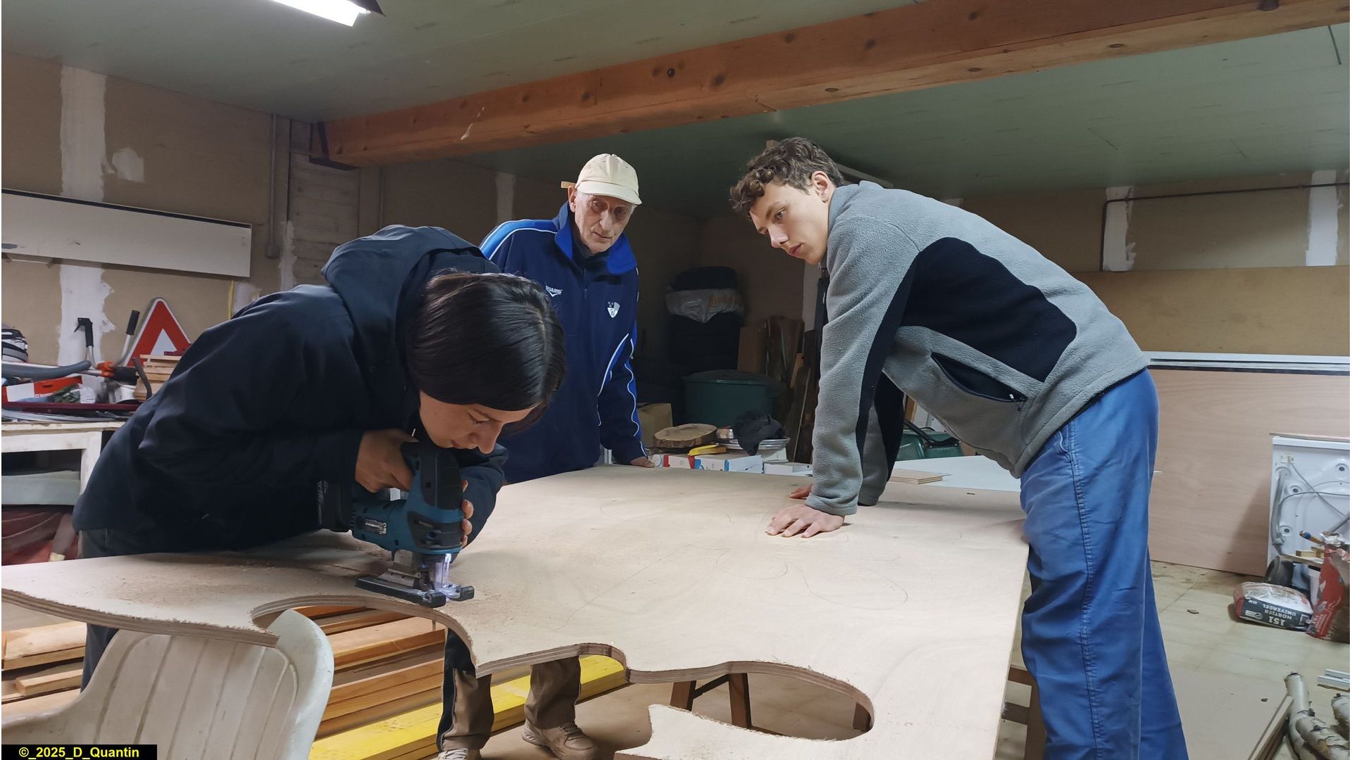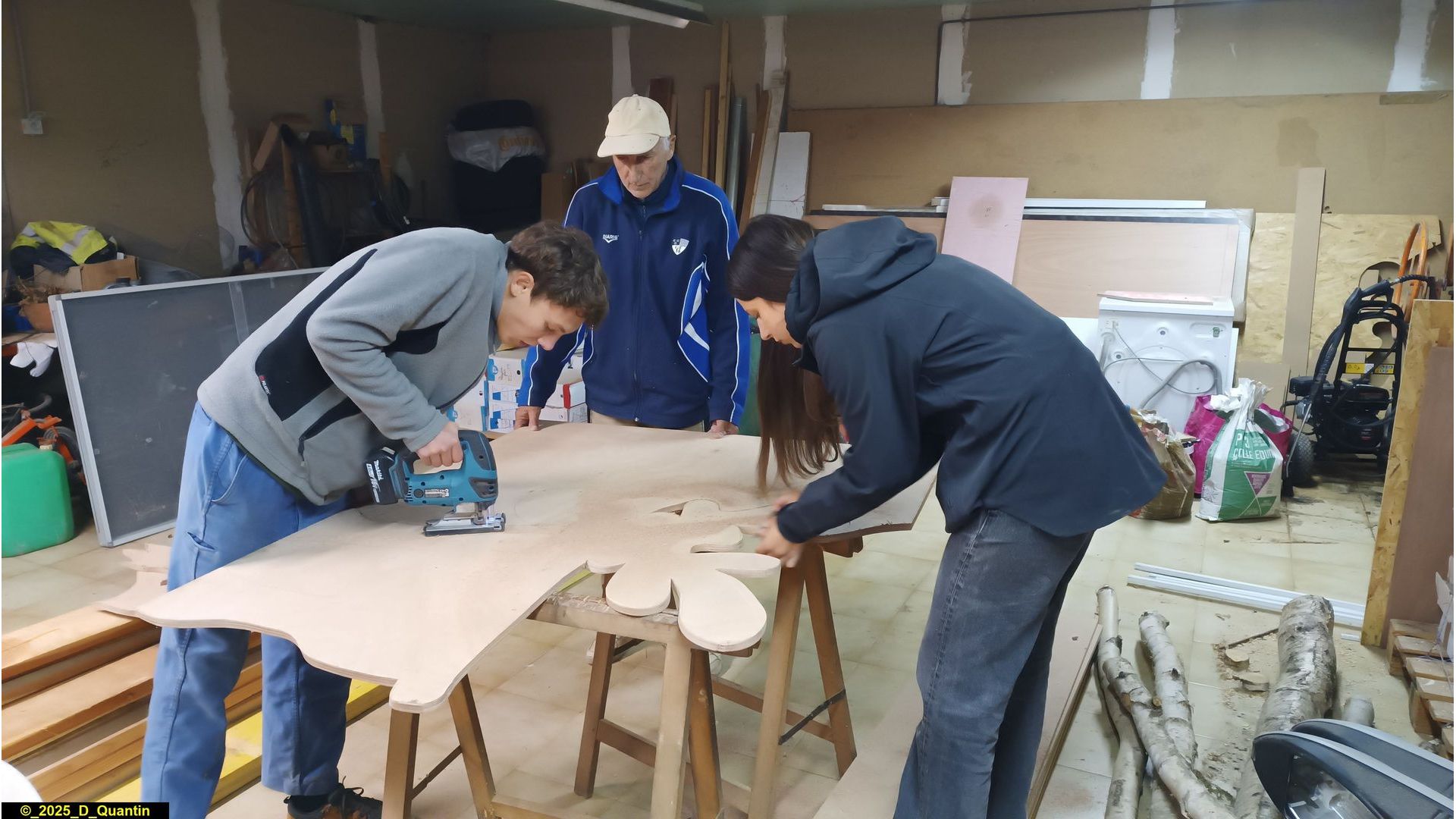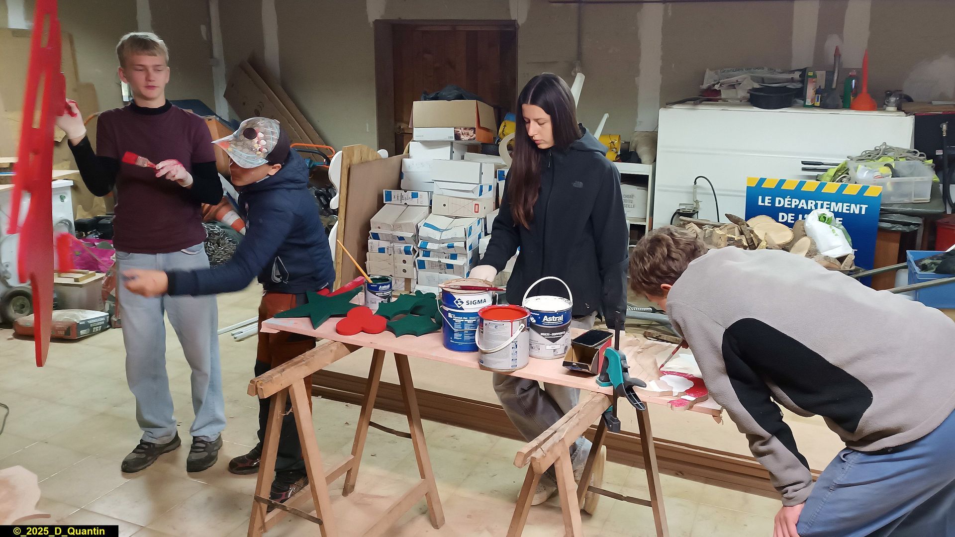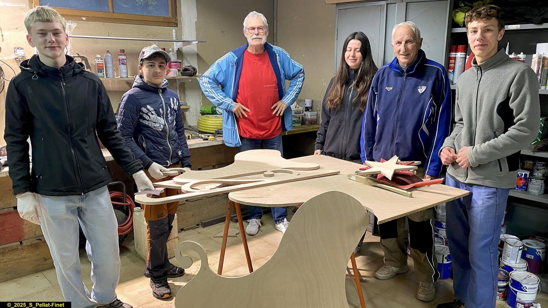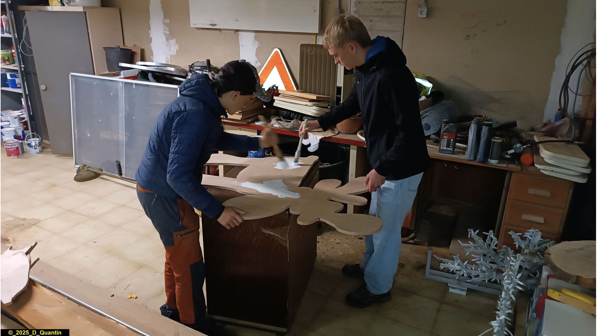 - création et peinture de silhouettes de décoration de Noël pour le village : rennes, traîneaux, Pères Noël, étoiles, boules de Noël, branches de houx, etc.